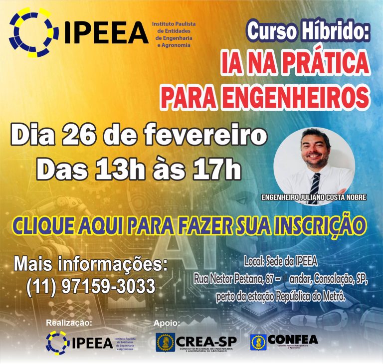 O Instituto Paulista de Entidades de Engenharia e Arquitetura (IPEEA) realiza no dia 26 de fevereiro o curso “Inteligência Artificial na prática para engenheiros”, voltado a profissionais que desejam compreender e aplicar ferramentas de IA no dia a dia da engenharia.