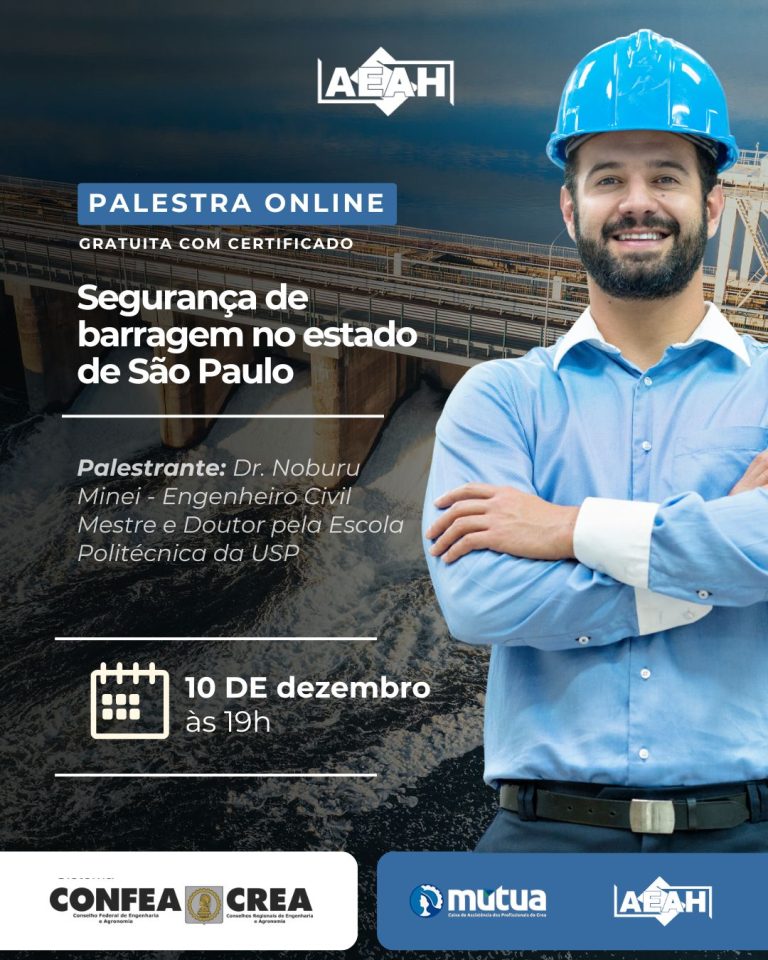 A Associação dos Engenheiros e Agrônomos de Hortolândia – AEAH, realiza nesta quarta-feira, 10 de dezembro, uma palestra especial sobre um tema essencial para a engenharia e para a sociedade: a segurança de barragens em São Paulo. Veja as informações abaixo: