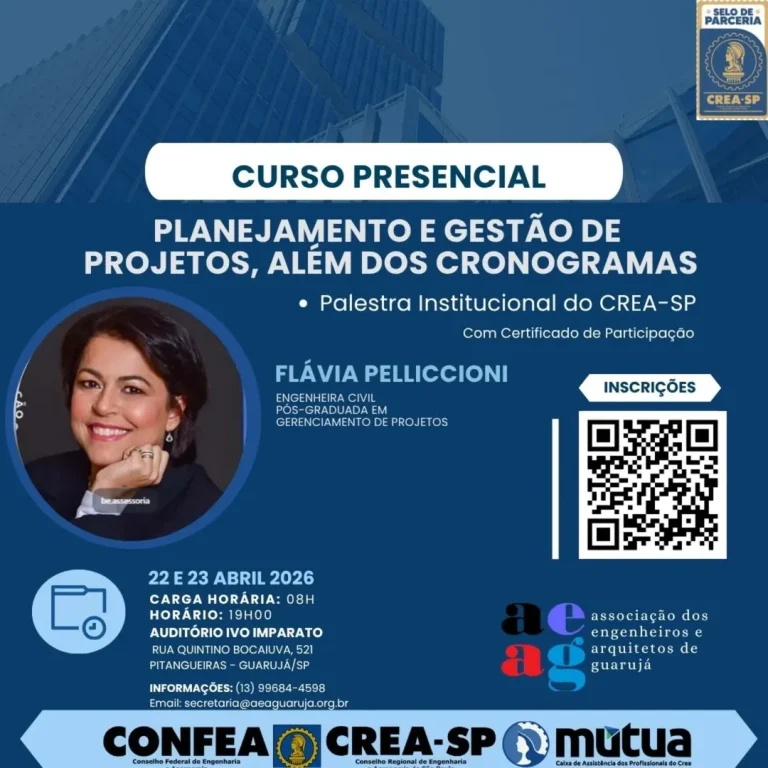 A Associação dos Engenheiros e Arquitetos de Guarujá – AEAG, em parceria com o CREA-SP, tem o prazer de convidá-lo(a) para participar do curso presencial Planejamento e Gestão de Projetos, além dos Cronogramas, cuja capacitação será ministrada pela Engenheira Civil Pós-Graduada em Gerenciamento de Projeto Flávia Pelliccioni, profissional com ampla experiência em gerenciamento de projetos.
