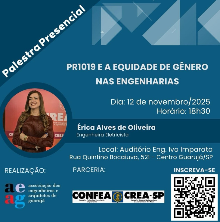 A Associação dos Engenheiros e Arquitetos de Guarujá, em parceria com o Comitê Gestor do Programa Mulher do CREA-SP, convida os profissionais e associados para uma palestra com a Engª Eletricista Érica Alves de Oliveira, integrante do Comitê Gestor do Programa Mulher do CREA-SP e engenheira de telecomunicações há 15 anos na Petrobras, que abordará o tema: PR1019 e a Equidade de Gênero nas Engenharias, Agronomia e Geociências.
