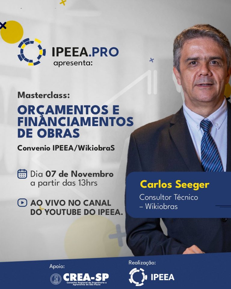 O IPEEA.PRO apresenta: Masterclass: Orçamentos e Financiamentos de Obras, com o convidado Carlos Seeger, Consultor Técnico da WikiobraS. 💡