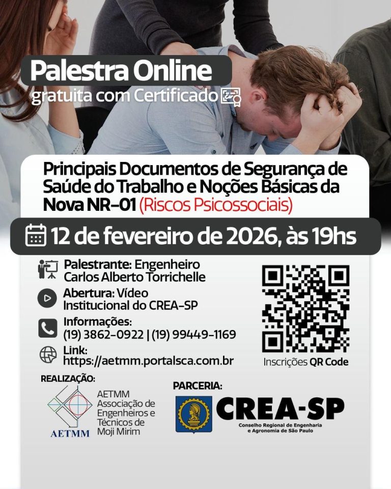 A AETMM – Associação dos Engenheiros e Técnicos de Moji Mirim – promove, no dia 12 de fevereiro, uma palestra on-line sobre a atualização da NR-01 (Norma Regulamentadora nº 1), com foco nos riscos psicossociais no ambiente de trabalho.