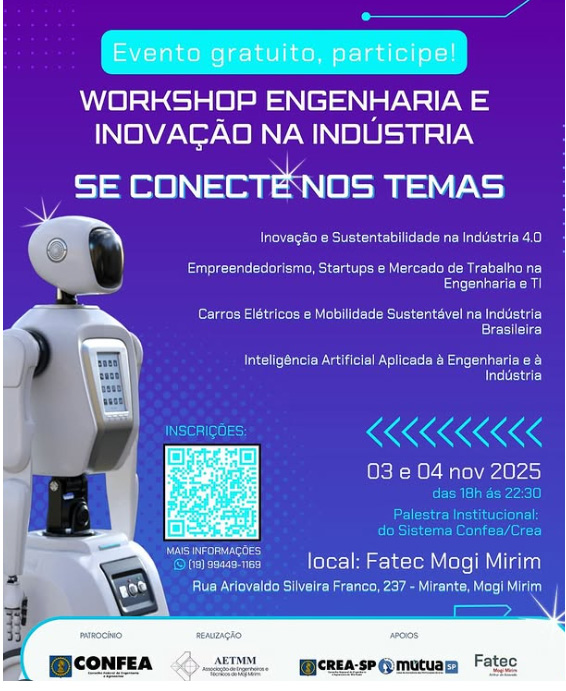 A Associação de Engenheiros e Técnicos de Mogi Mirim (AETMM), promove nos dias 03 e 04 de novembro/2025 esse workshop de forma presencial com o patrocínio do Conselho Federal de Engenharia e Agronomia (CONFEA) e apoio da FATEC Mogi Mirim.