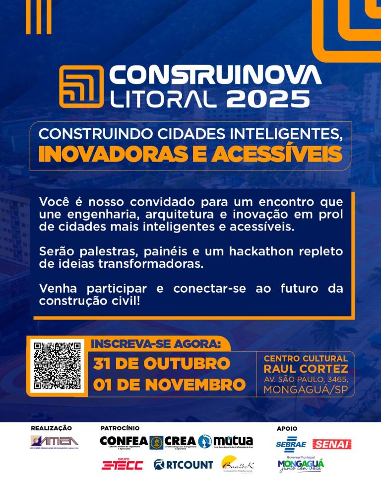 Nos dias 31 de outubro e 1º de novembro, Mongaguá será palco do maior evento do setor no Litoral Paulista, reunindo engenheiros, arquitetos, técnicos, estudantes e empresas para debater e construir cidades mais inteligentes, inovadoras e acessíveis.