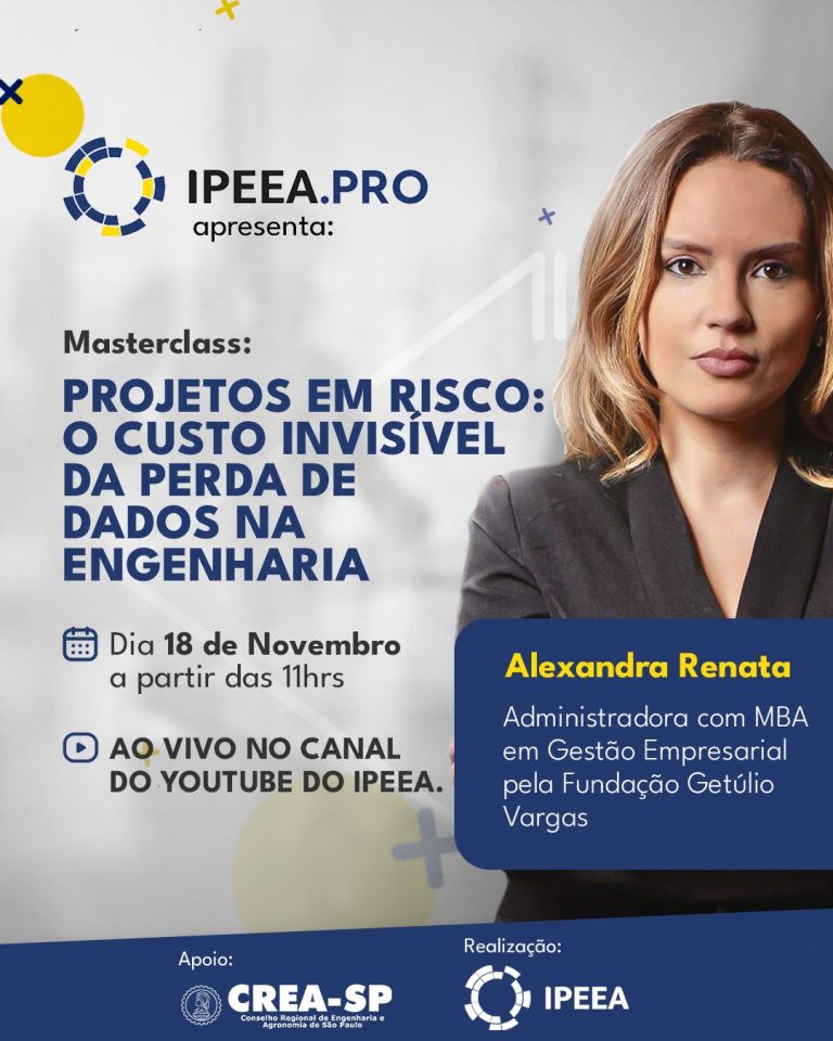 O IPEEA.PRO apresenta uma masterclass imperdível sobre Projetos em Risco: o custo invisível da perda de dados na engenharia, com Alexandra Renata, Administradora com MBA em Gestão Empresarial pela Fundação Getúlio Vargas. 💡