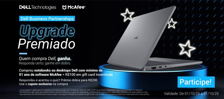 Dinâmica: cada produto elegível comprado com cupom exclusivo dá direito a R$ 100 em voucher digital (máximo de 3 unidades por CPF/CNPJ). Além disso, poderão participar de um quiz a respeito da Dell e Programa de Parcerias, podendo dobrar o valor da premiação